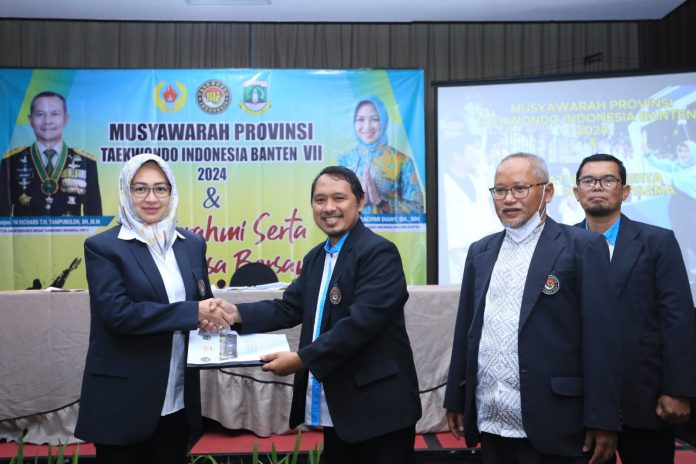 BBC, Tangsel – Mantan Walikota Tangerang Selatan Airin Rachmi Diany kembali terpilih menjadi Ketua Umum Pengurus Provinsi (Pengprov) Taekwondo Indonesia (TI) Banten masa bakti 2024-2028. Airin terpilih secara aklamasi dalam Musyawarah Provinsi (Musprov) TI Banten ke-VII di Soll Marina Hotel, Kota Tangerang Selatan, Kamis (28/3/2024).