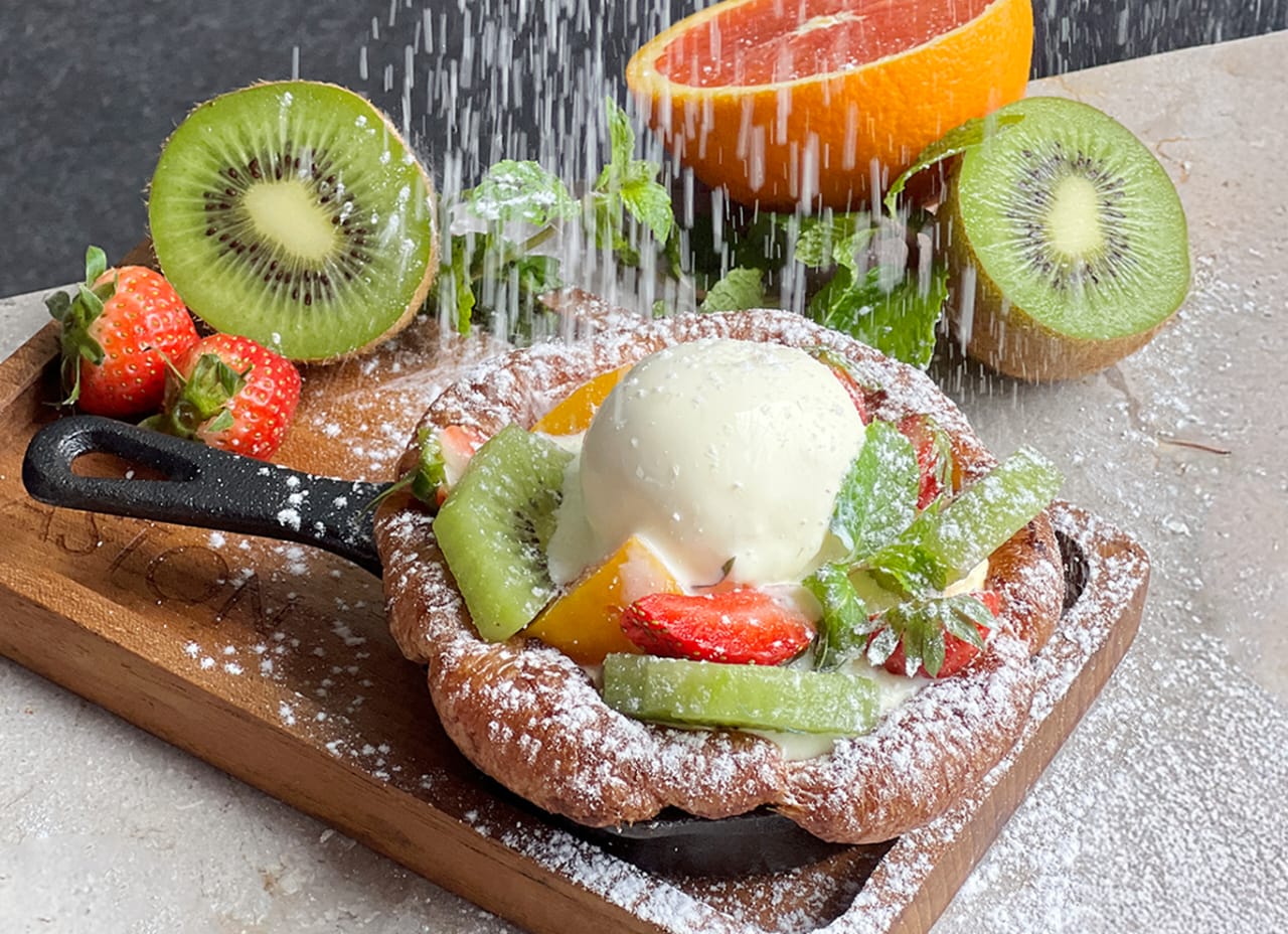 Di dalam pancakenya terdapat pastry cream yang lembut, serta isian irisan buah segar seperti stroberi, jeruk mandarin, kiwi, dan peach. Sajian ini dilengkapi dengan satu scoop es krim vanila yang menambah sensasi manis dan menyegarkan. Taburan gula halus diatasnya mempercantik tampilan sekaligus memperkaya cita rasa.