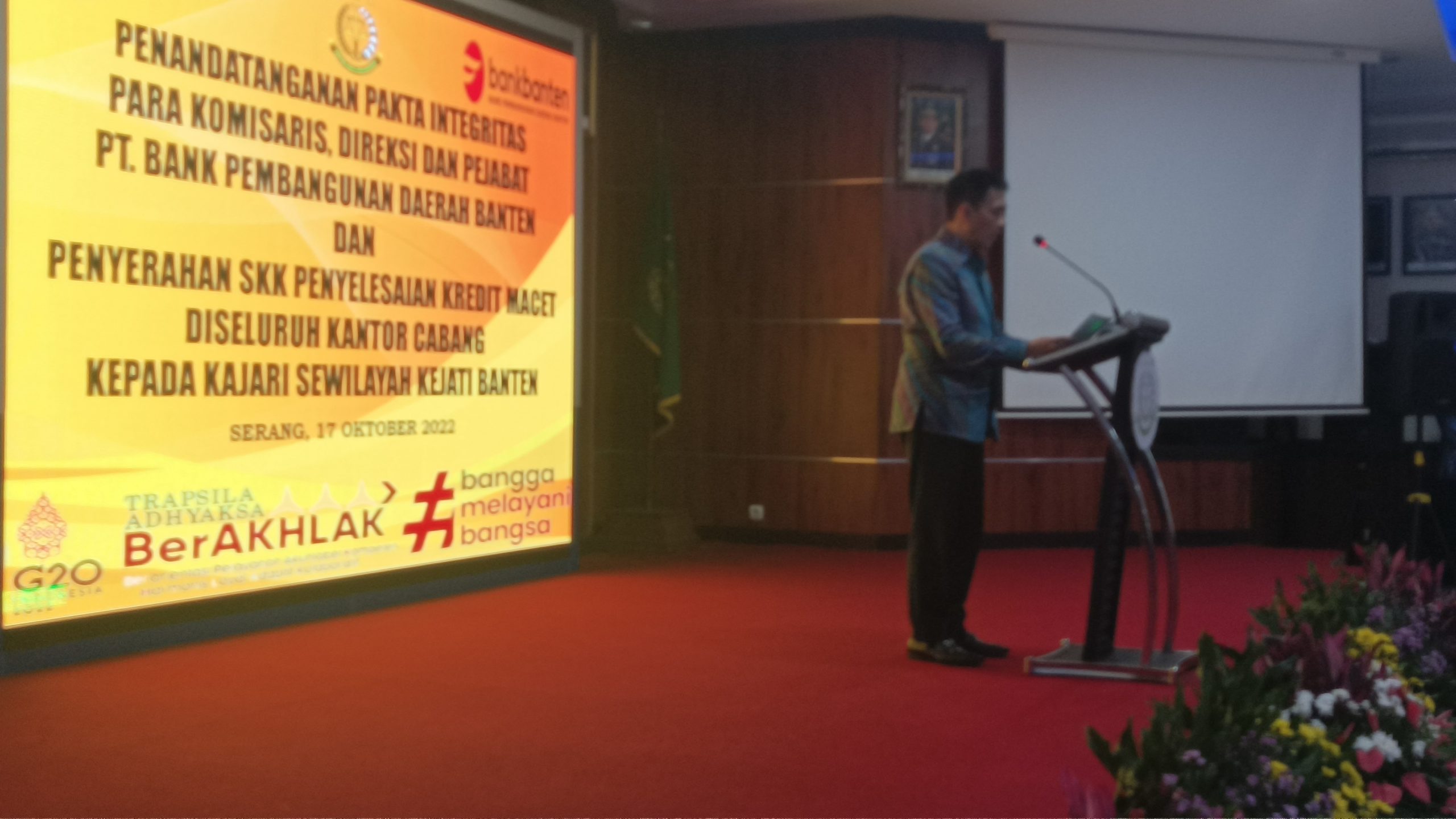 Hal tersebut disampaikan Direktur Utama Bank Banten, Dr. Agus Syabarrudin pada kegiatan Penandatanganan Pakta Integritas Manajemen Bank Banten dan Penyerahan Surat Kuasa Khusus (SKK) Peyelesaian Kredit Bermasalah di seluruh Kantor Cabang Bank Banten kepada Kejaksaan Negeri di wilayah Provinsi Banten.