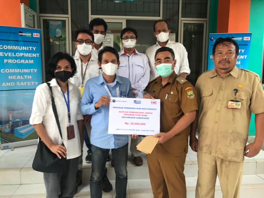 BBC, Cilegon – PT. IRT bersama kontraktor pembangunan PLTU Jawa 9&10, PT DHII dan PT HK kembali melakukan donasi pembangunan jamban untuk warga yang tinggal di Kelurahan Lebakgede, Kecamatan Pulomerak, Kota Cilegon, Selasa (30/11/21). Pemberian bantuan jamban itu diserahkan secara simbolis kepada Kepala Kelurahan Lebakgede, Suwandi.