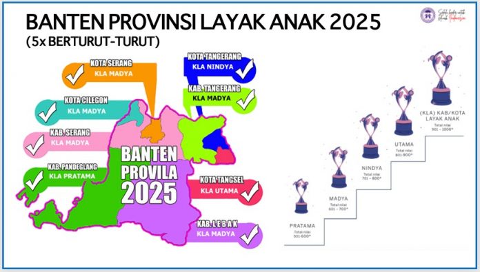 “Sementara wilayah Kabupaten Tangerang, Kabupaten Lebak, Kota Cilegon, Kabupaten Serang, dan Kota Serang meraih madya, dan Kabupaten Pandeglang meraih predikat pratama,” katanya.