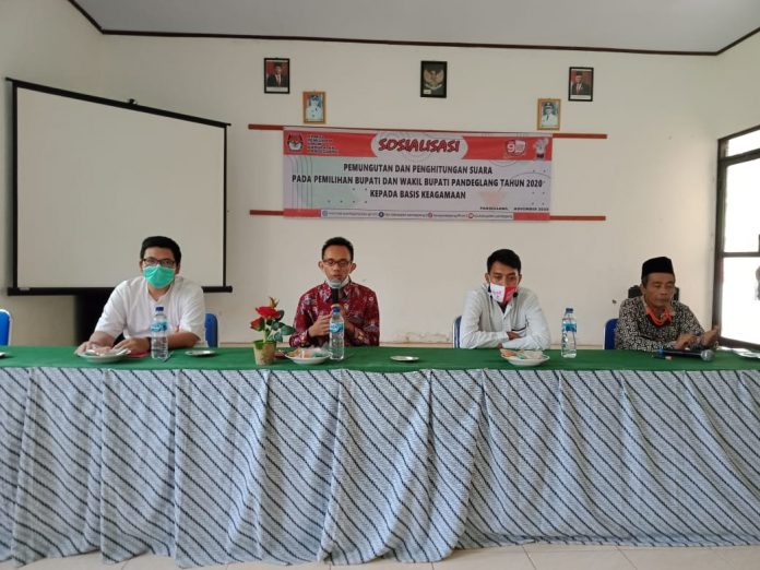 BBC, Pandeglang – Dalam meningkatkan partisipasi pada pemilihan Bupati dan wakil bupati Kabupaten Pandeglang 9 Desember 2020 mendatang, Komisi Pemilihan Umum (KPU) Kabupaten Pandeglang menggandeng Persatuan Wartawan Indonesia (PWI) Kabupaten Pandegleng, dalam acara sosialisasi Penghitungan dan pemungutan suara pada pemilihan bupati dan wakil bupati Pandeglang 2020 kepada basis keagamaan, di aula kantor Kecamatan Cipeucang, Kamis (19/11/2020). Dalam acara tersebut dihadiri oleh Camat Cipeucang Dedi Taftajani dan Sekmat Cipeucang Yayan, sedangkan sebagai narasumber komisioner KPU Kabupaten Pandeglang Samsuri dan Ketua PWI Kabupaten Pandeglang Iman Fathurohman.