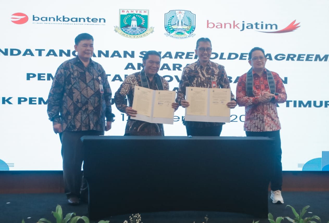 BBC, Serang – Penjabat (Pj) Gubernur Banten Al Muktabar, Pj Gubernur Jawa Timur Adhy Karyono bersama Direktur Utama Bank Jatim Busrul Iman dan Direktur Utama Bank Banten Muhammad Busthami melakukan penandatanganan Shareholder Agreement (SHA) di Grand Sahid Jaya Hotel, Jl Jendral Sudirman Kav.86 Jakarta, pada Kamis, 12 Desember 2024. Penandatangan kerja sama ini sebagai wujud kerja sama pengembangan usaha Bank Banten dengan Bank Jawa Timur.
