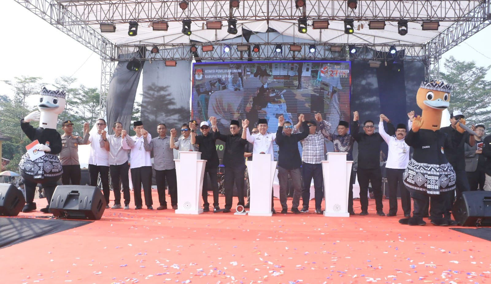 BBC, Serang – Komisi Pemilihan Umum (KPU) Kabupaten Serang resmi meluncurkan atau Launching Maskot Dama Dami atau Datang Bersama Datang Memilih dan Jingle Pemilihan Bupati-Wakil Bupati (Pilbup-Wabup) Serang Tahun 2024 di Alun-alun Kecamatan Tunjung Teja, Rabu 19/6/2024. KPU menargetkan, 70 persen lebih partisipasi pemilih pada Pemilihan Kepala Daerah (Pilkada) Serentak 2024 di Kabupaten Serang.