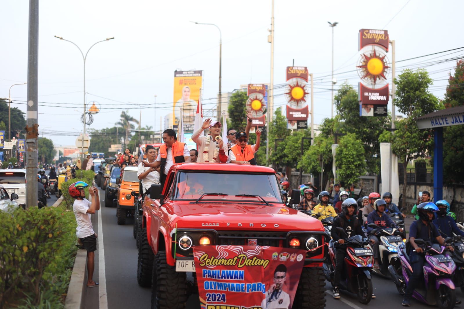 BBC, Serang – Pahlawan Olimpiade Paris yang meraih emas dari cabang olahraga angkat besi asal Kota Serang Rizki Juniansayah diarak keliling Kota Serang. Kedatangan Rizk dari Jakarta disambut Penjabat (Pj) Gubernur Banten Al Muktabar saat tiba di kantor PJR Polda Banten, Rabu (14/8/2024). Rizki juga langsung dikenakan kalung bunga oleh Pj Gubernur Banten Al Muktabar.