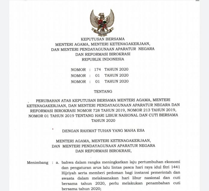 Penambahan terletak pada cuti bersama yang sebelumnya empat hari menjadi delapan hari. Perubahan ini tercantum pada Surat Keputusan Bersama (SKB) tiga Menteri bernomor 174 Tahun 2020, 01 Tahun 2020, dan 01 Tahun 2020 yang ditandatangani pada tanggal 9 Maret 2020 mengatur tentang Perubahan Atas Keputusan Bersama Menteri Agama, Menteri Ketenagakerjaan, dan Menteri PANRB No. 728 Tahun 2019, No. 213 Tahun 2019, No. 01 Tahun 2019 tentang Hari Libur Nasional dan Cuti Bersama Tahun 2020.