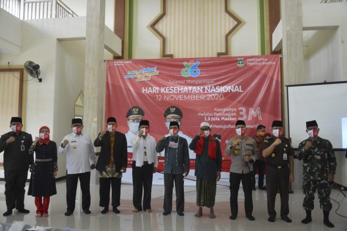 Dalam situasi pandemi Covid-19, Peringatan Hari Kesehatan Nasional 2020 diisi dengan Kampanye 3M (Memakai masker, Mencuci tangan, Menjaga jarak) Melalui Pembagian 1,3 Juta Masker. Turut hadir: Kepala Dinas Kesehatan Provinsi Banten Ati Pramudji H, Kepala BPBD Provinsi Banten Nana Suryana, Pjs. Bupati Pandeglang Gunawan Rusminto, Forkopimda Kabupaten Pandeglang, Pimpinan PP Riyadhus Sholihin Fachruddin Nu’man, serta para tamu undangan.