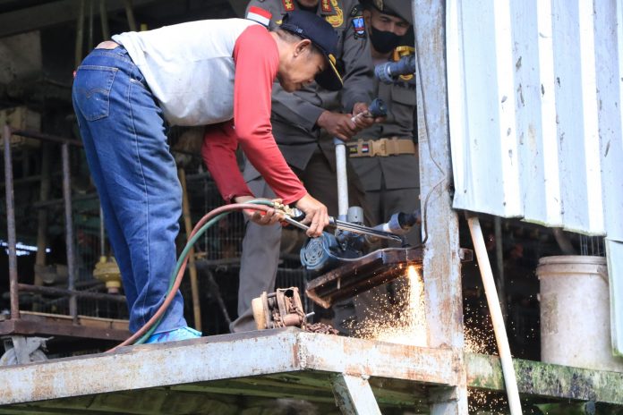”Ini pompa air mengalir ke ayam dan kita cabut listriknya, kalau melihat bangunan seperti ini rasanya tidak cukup sehari untuk membongkarnya. Mudah-mudahan mereka dengan diberikan sanksi mau memindahkan ayamnya,” papar Ajat.