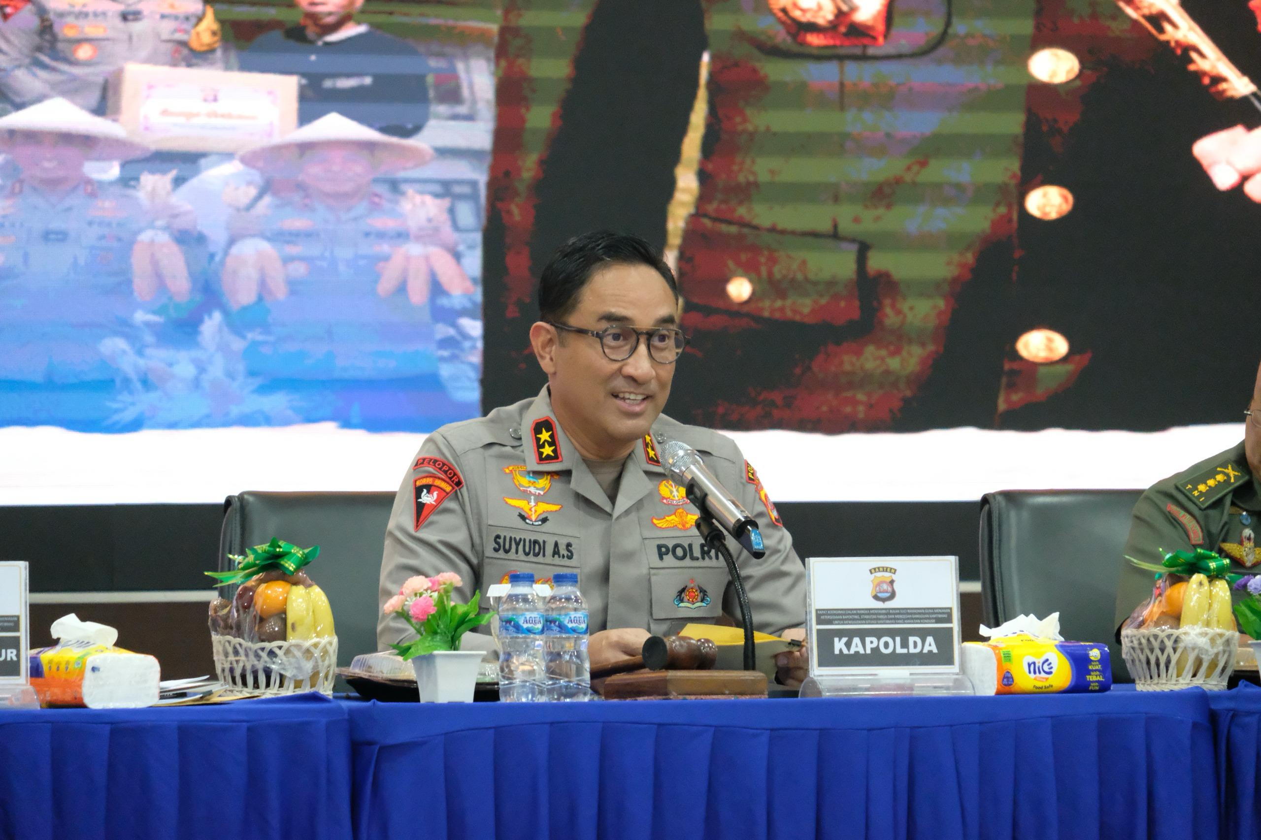 Rapat dipimpin oleh Kapolda Banten Irjen Pol Suyudi Ario Seto, dan dihadiri oleh Wakil Gubernur Banten Dimyati Natakusumah, Wakapolda Banten Brigjen Pol Hengki, Forkopimda Provinsi Banten, PJU Polda Banten, Kasiops Korem 064/Maulana Yusuf Kolonel Inf Harry Prabowo, Wakil Kepala Kejaksaan Tinggi Banten Yuliana Sagala, serta tokoh agama.
