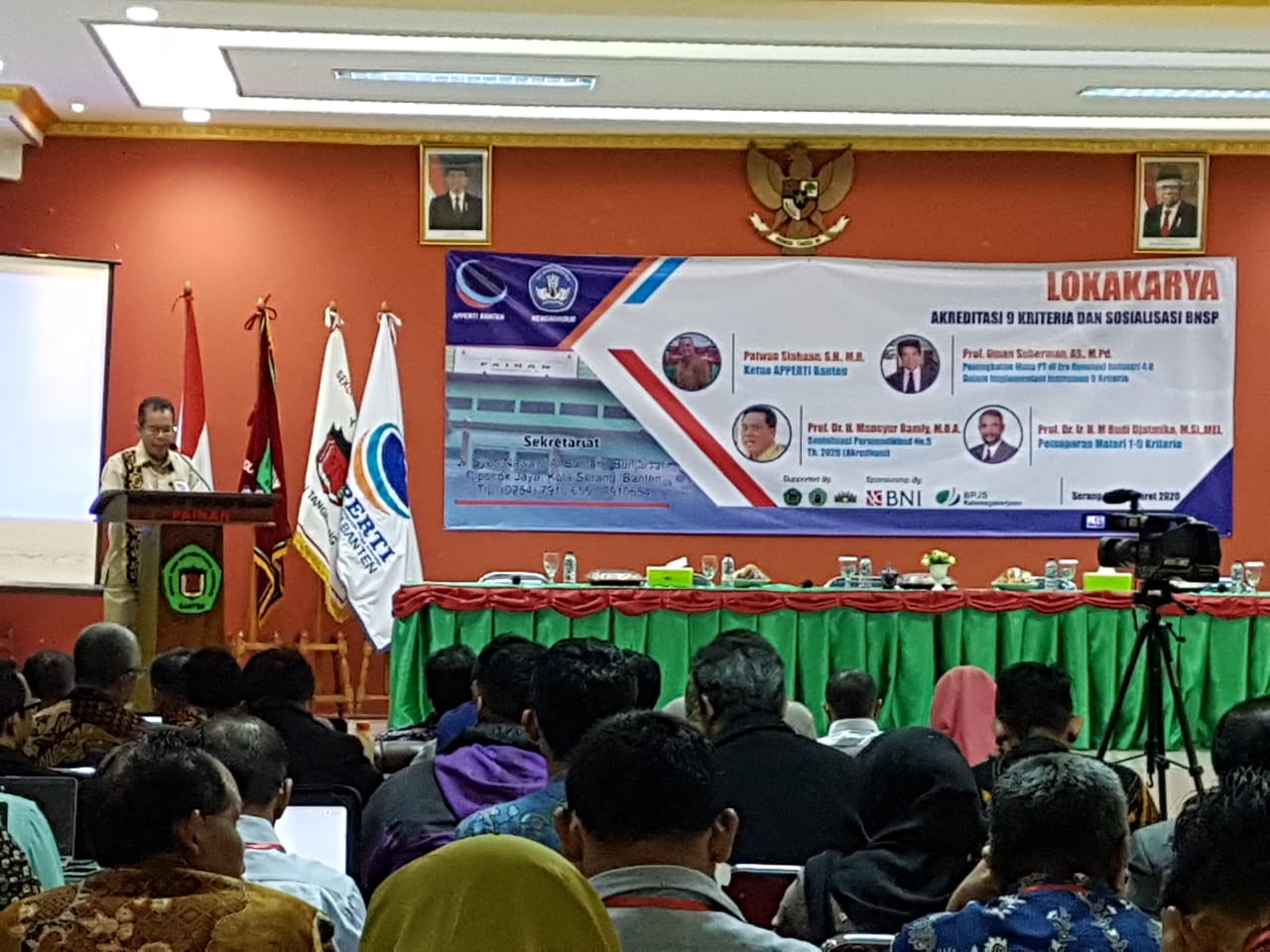 BBC, Serang – adanya berbagai perubahan yang terjadi pada pengelolaan akreditasi perguruan tinggi yang dikeluarkan Badan Akreditasi Nasional Perguruan Tinggi, Aliansi Penyelenggara Perguruan Tinggi Indonesia (APPERTI) Banten mengadakan kegiatan loka karya dengan tema “Akreditasi 9 kriteria dan sosialisasi BNSP” yang digelar di Kampus STIH Painan Serang, Kamis 12/3/2020.