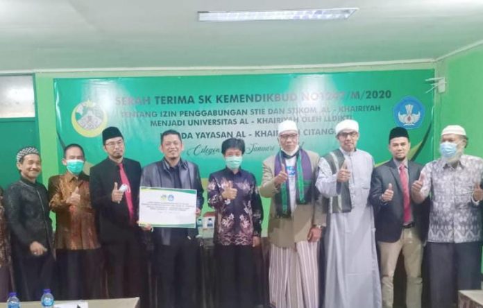 BBC, Cilegon – Sekolah Tinggi Ilmu Ekonomi Al Lahiriyah telah resmi menjadi Universitas. Perubahan nama ini ditandai dengan penyerahan SK Kemendikbud yang diserahkan langsung oleh Kepala Lembaga Layanan Pendidikan Tinggi (LLDIKTI) Wilayah IV Uman Suherman kepada ketua PB Al Khairiyah Ali Mujahidin di Kota Cilegon, Minggu 24/1/2021.